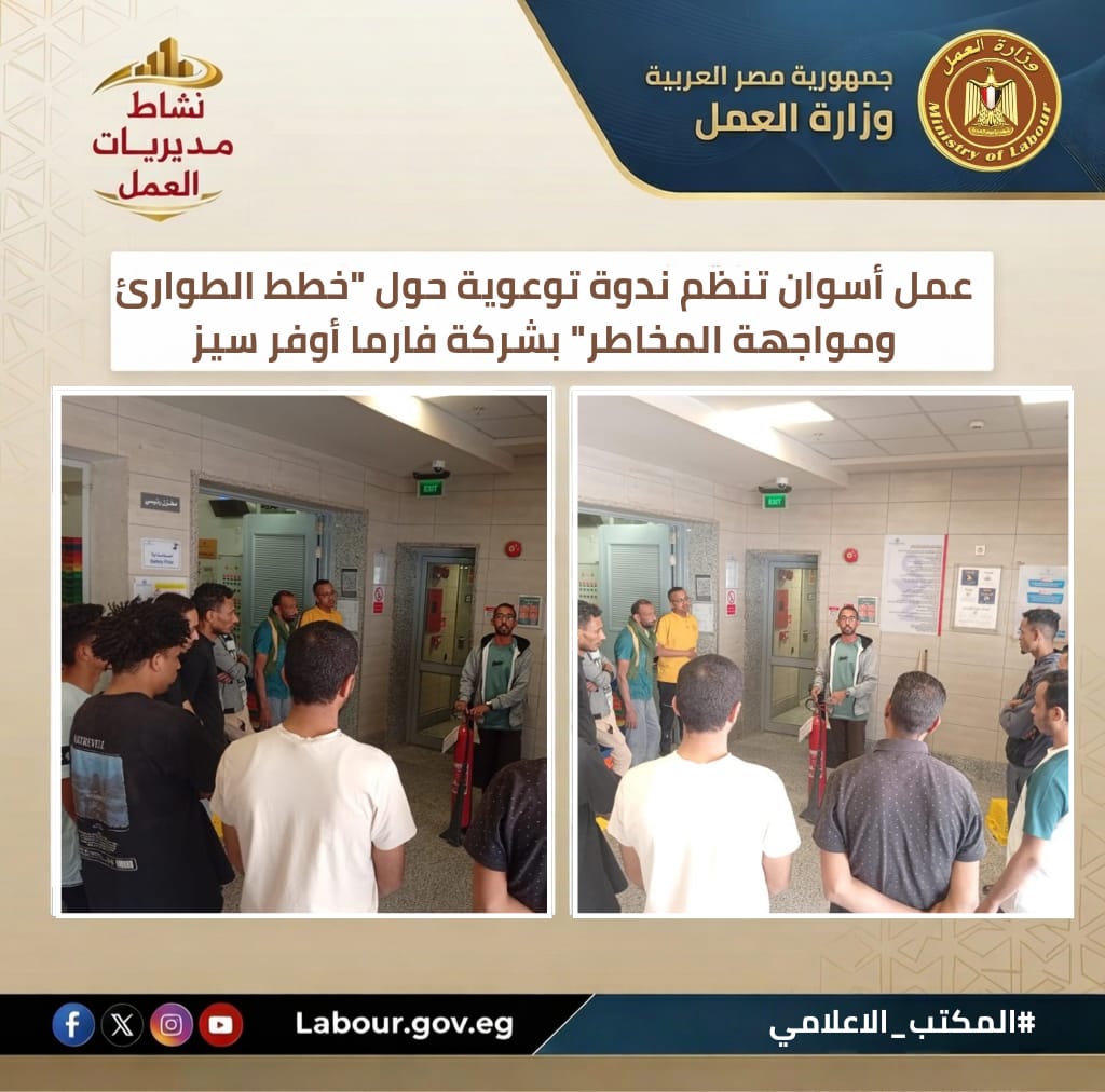 تنفيذًا لتوجيهات وزير العمل حسن رداد، نظم مكتب السلامة والصحة المهنية بأسوان ندوة للعاملين بشركة "فارما أوفر سيز للأدوية". وتضمنت الندوة تدريباً عملياً على مواجهة المخاطر واستخدام طفايات الحريق، لضمان سلامة الكوادر والمنشآت الحيوية وتطبيق المعايير القياسية لتأمين بيئة العمل.