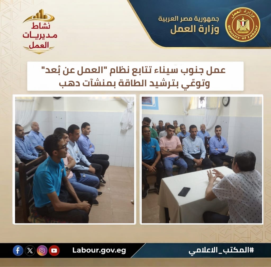 تنفيذًا لتوجيهات وزير العمل حسن رداد، تابع مكتب عمل دهب، بتكليف من أكرم محمد سيد أحمد، انتظام سير "العمل عن بُعد" بالشركات. كما تضمنت الجولة عقد ندوة توعوية حول ترشيد استهلاك الكهرباء، دعماً لتوجهات الدولة في الاستخدام الأمثل للموارد وتعزيز الوعي البيئي داخل بيئة العمل.