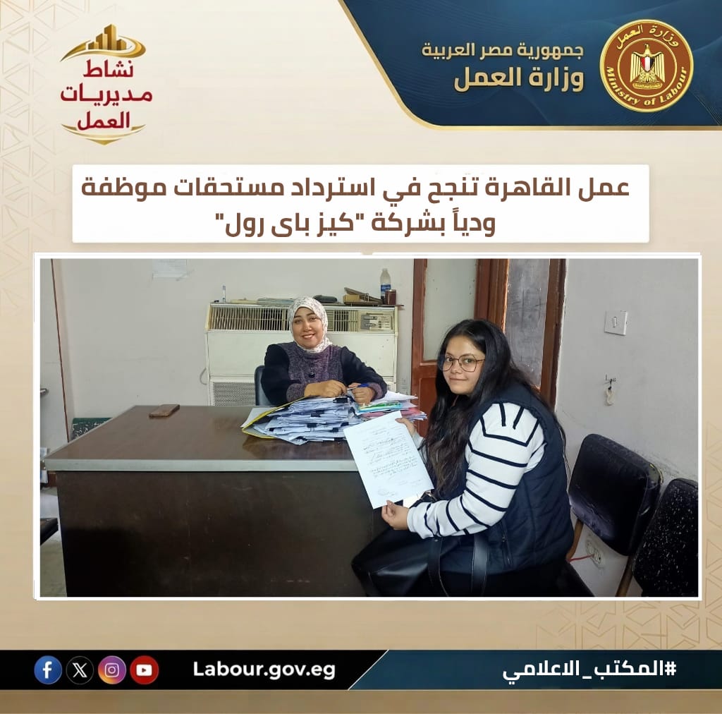 5. استرداد مستحقات موظفة ودياً بشركة "كيز باى رول" بالقاهرة