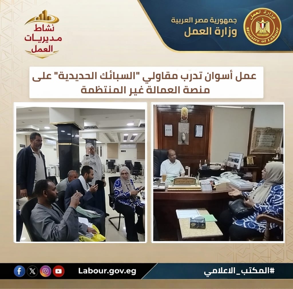 تنفيذًا لتوجيهات وزير العمل حسن رداد، عقدت مديرية عمل أسوان لقاءً موسعاً بشركة "السبائك الحديدية" لتدريب المقاولين على استخدام المنصة الإلكترونية. وتستهدف الخطوة توسيع قاعدة المسجلين لضمان شمول العمال بمنظومة الرعاية الصحية والاجتماعية والتأمينية تماشياً مع خطة التحول الرقمي.