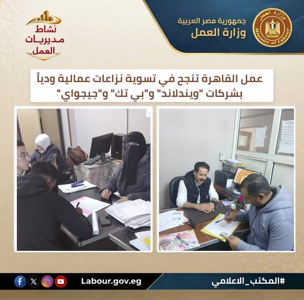 10. إنهاء 3 نزاعات عمالية ودياً بشركات "ويندلاند وبي تك وجيجواي" بالقاهرة