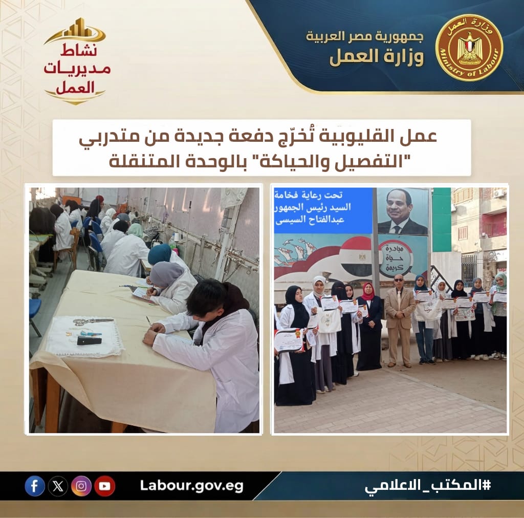 تنفيذًا لتوجيهات وزير العمل حسن رداد، أتمت مديرية عمل القليوبية، بقيادة فوزي صابر، تدريب 13 شاباً وفتاة بكفر شبين. وتستهدف الدورة، ضمن مبادرة "حياة كريمة"، تأهيل المتدربين فنيًا على مهنة الحياكة وفق أحدث النظم لتمكينهم من الالتحاق بسوق العمل أو بدء مشروعاتهم الخاصة.