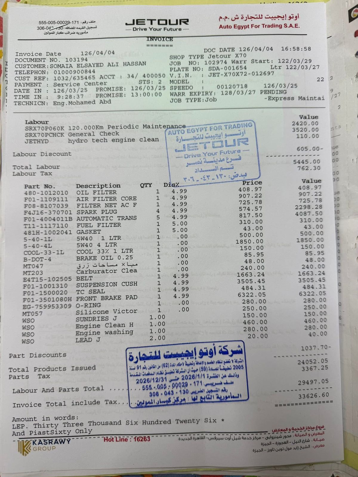 وتابع: والعربيه داخلة التوكيل يوم ٢٥/٣ مفيش اي مشكله عندي في الفتيس ، صيانات العربيه لحد ال ١٢٠ في التوكيل وبعد الكشف علي العربيه لمده لا تقل عن اسبوع ، كلموني وقالو لي المشكله فعلا ان ال Valve body بتاع الفيس بايظ وهنغيره في الضمان ، وهنبعت للصين ناخد موافقة وتوفر قطعه الغيار التوكيل عاجز عن الحل السريع ، ومتابعة العملاء توكيل غير مؤتمن علي سيارات الناس والله.