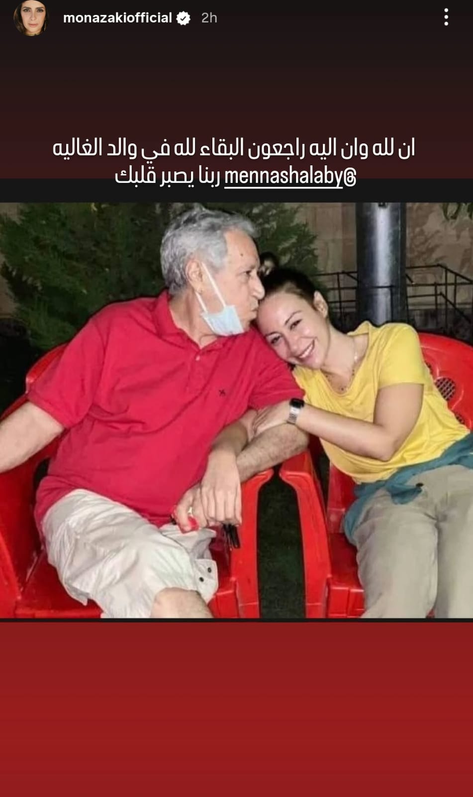 وكتبت منى زكي من خلال حسابها الرسمي عبر موقع تبادل الصور والفيديوهات القصيرة إنستجرام، عبر خاصية ستوري: إن لله وإن إليه راجعون البقاء لله في والد الغالية منة شلبي.. ربنا يصبر قلبك.