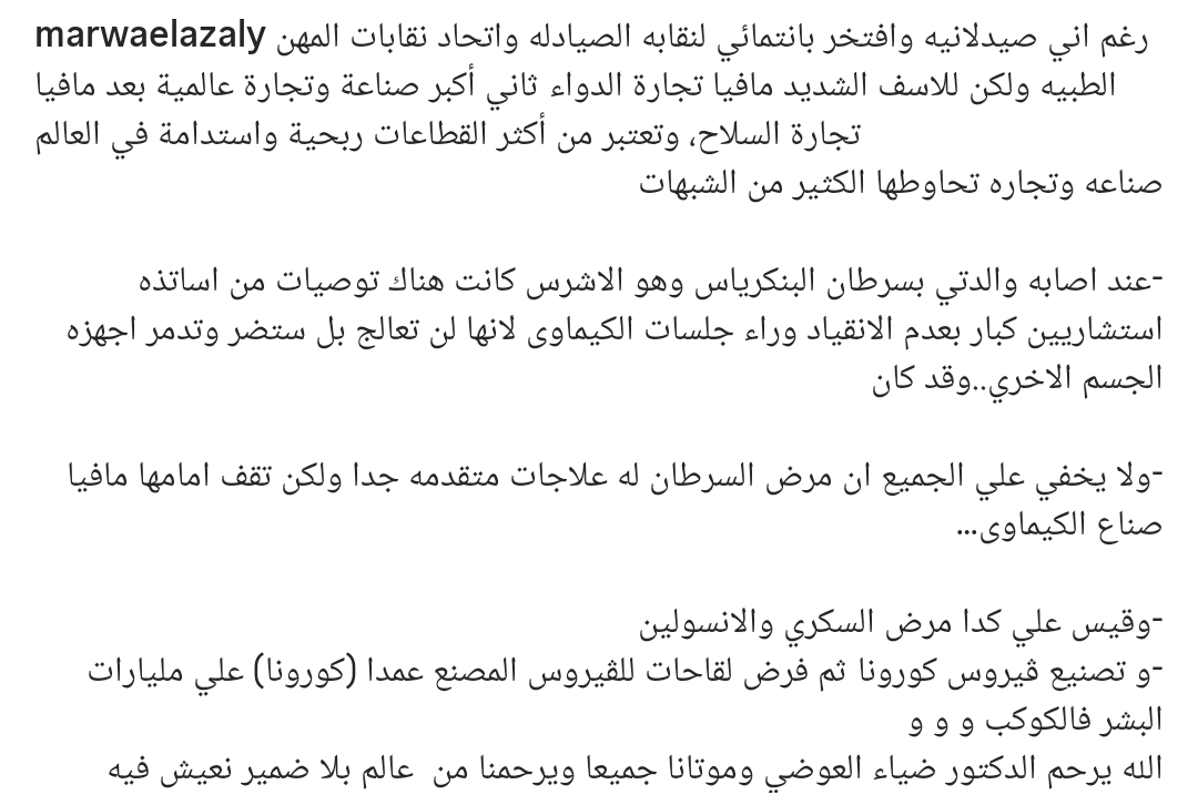 وكتبت من خلال حسابها الرسمي عبر موقع تبادل الصور والفيديوهات القصيرة إنستجرام، قالت: رغم اني صيدلانيه وافتخر بانتمائي لنقابه الصيادله واتحاد نقابات المهن الطبيه ولكن للاسف الشديد مافيا تجارة الدواء ثاني أكبر صناعة وتجارة عالمية بعد مافيا تجارة السلاح،