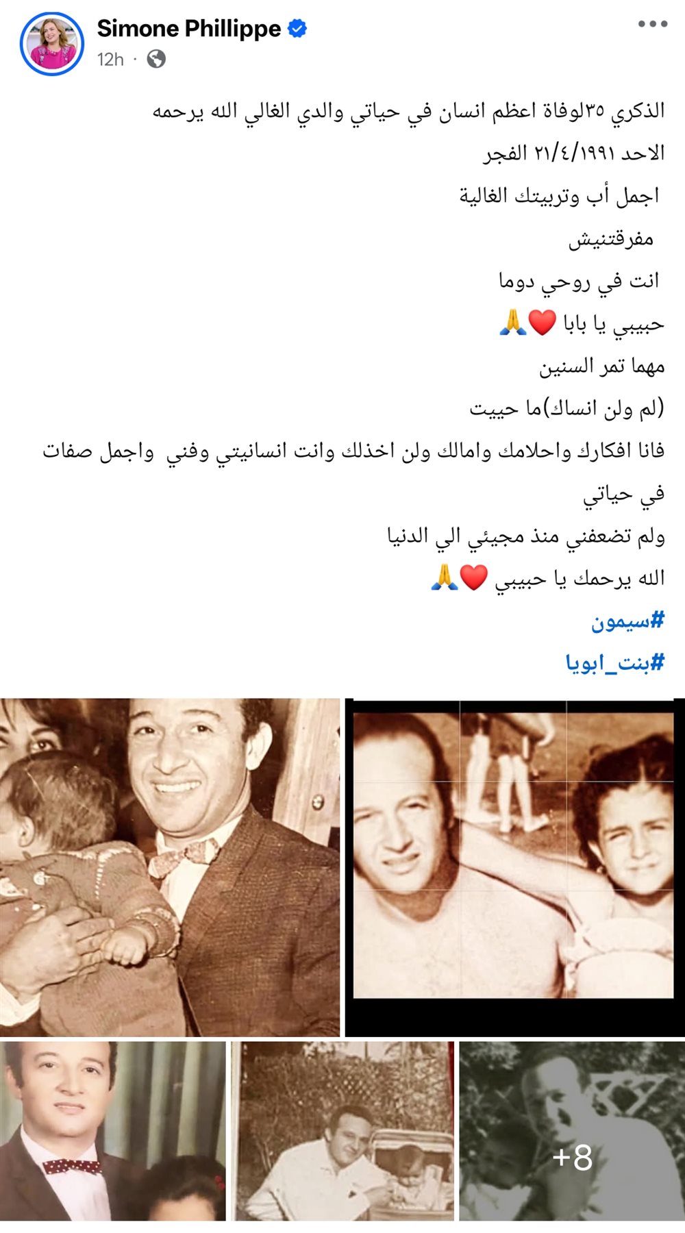 ووجهت سيمون كلمات مؤثرة له، وكتبت من خلال حسابها الرسمي عبر موقع التواصل الاجتماعي فيسبوك، قالت: الذكري ٣٥ لوفاة اعظم انسان في حياتي والدي الغالي الله يرحمه.. الاحد ٢١/٤/١٩٩١ الفجر.