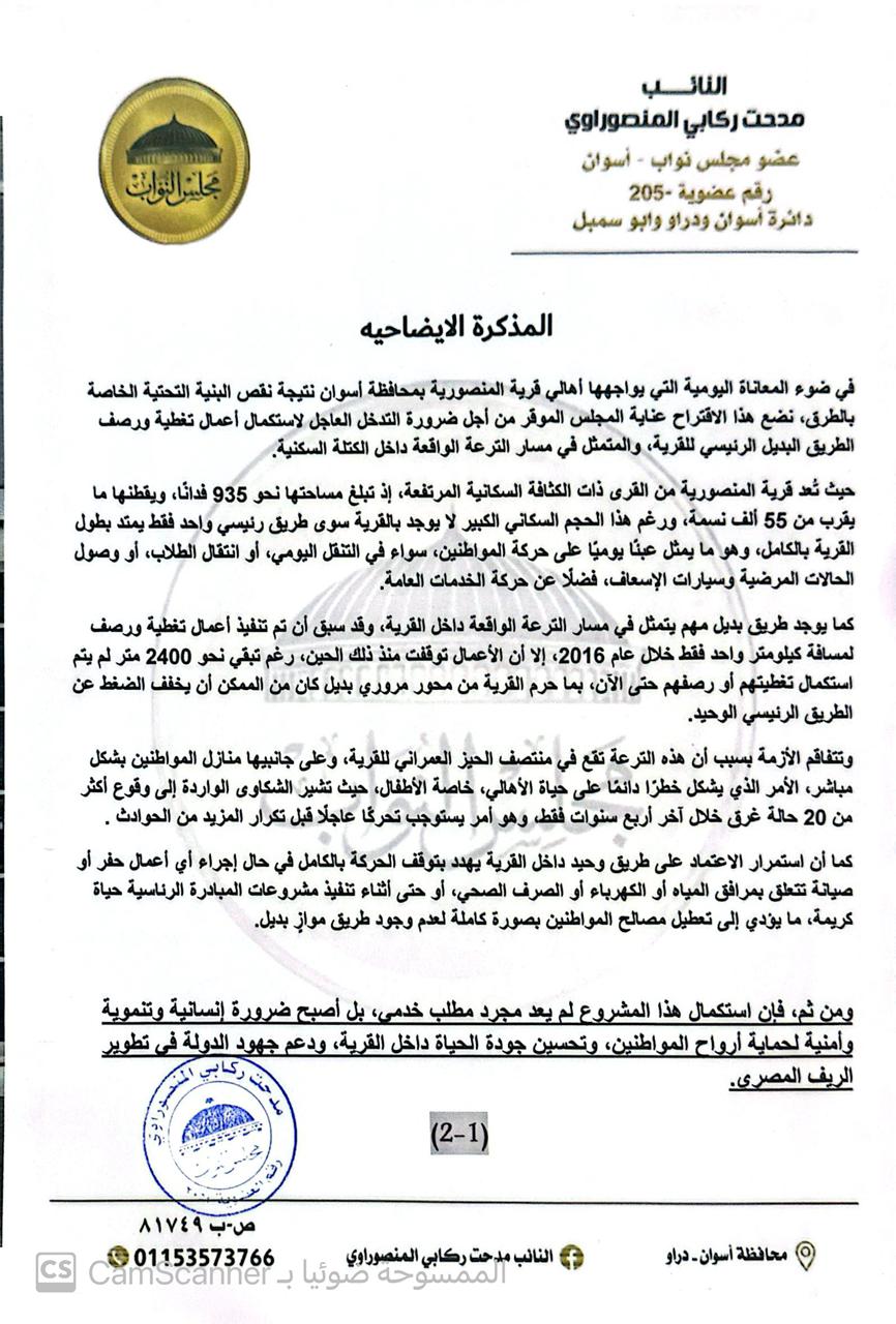 تقدّم مدحت ركابي المنصوراوي، عضو مجلس النواب عن الحزب المصري الديمقراطي الاجتماعي، باقتراح برغبة إلى هشام بدوي، موجّه إلى رئيس مجلس الوزراء، ووزيرة التنمية المحلية، ووزير الموارد المائية والري، ووزيرة الإسكان، بشأن سرعة استكمال أعمال تغطية ورصف الطريق البديل الرئيسي المار عبر ترعة المنصورية داخل قرية المنصورية بمحافظة أسوان.