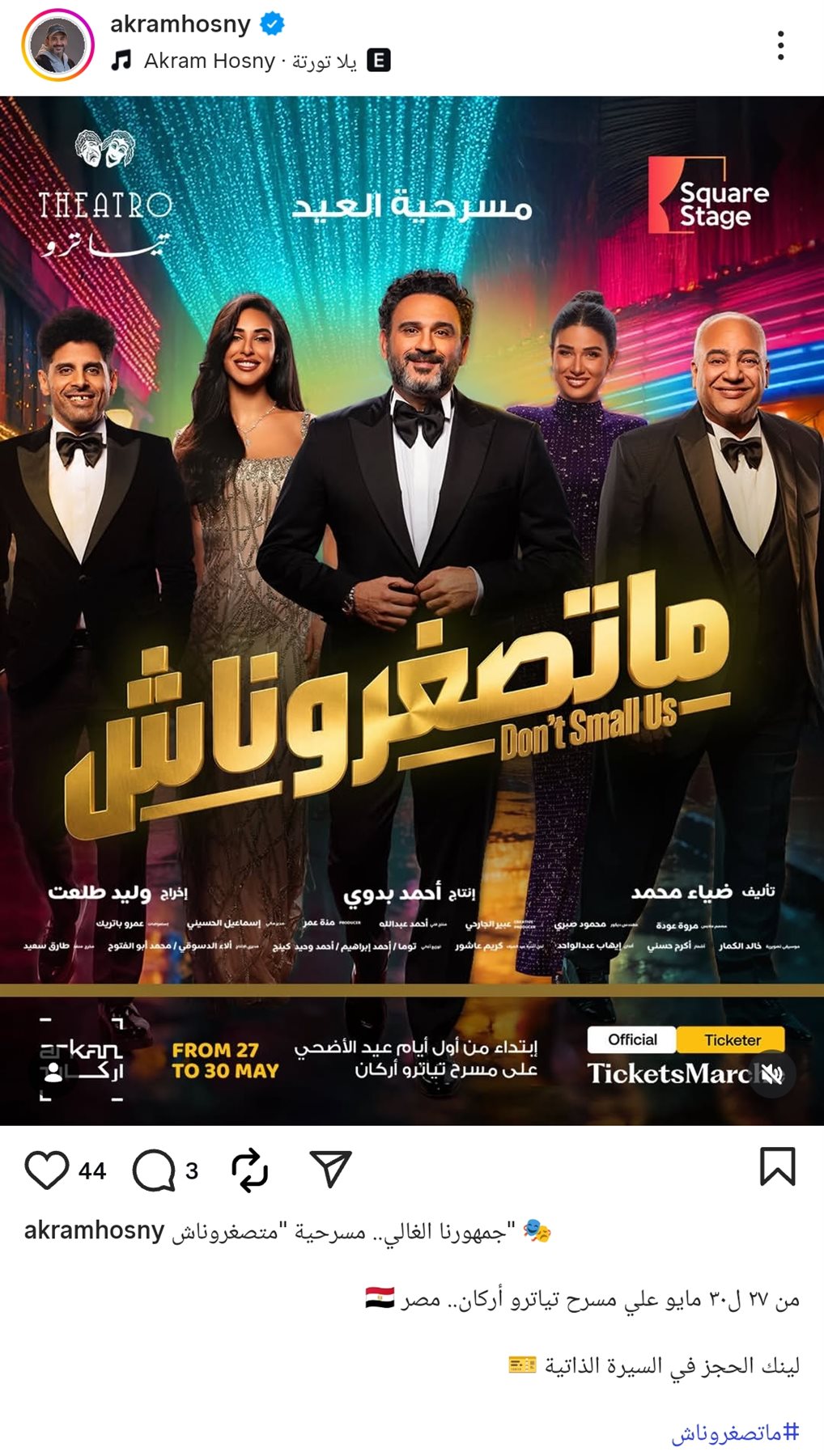 وشارك أكرم حسني جمهوره بوستر المسرحية، من خلال حسابه الرسمي عبر موقع تبادل الصور والفيديوهات القصيرة إنستجرام، وعلق: جمهورنا الغالي.. مسرحية متصغروناش.. من ۲۷ ل ٣٠ مايو علي مسرح تياترو أركان.. مصر.