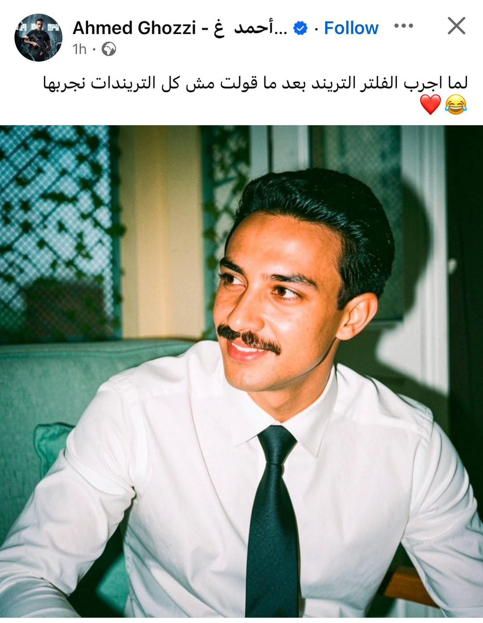 وعلّق غزي على الصورة بطريقة طريفة، قائلاً: “لما أجرب فلتر التريند بعد ما قولت مش كل التريندات نجربها”، مضيفًا رموزًا تعبيرية، في إشارة ساخرة لتجربته مع الفلاتر المنتشرة على مواقع التواصل الاجتماعي.