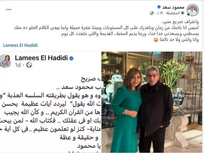 وقال محمود سعد في منشوره: "اعتراف صريح مني.. لميس أنا بحبك من زمان وبقدرك على كل المستويات، وبيننا عشرة جميلة، ولما ييجي الكلام الحلو ده منك يبسطني ويسعدني جدًا جدًا.. وربنا يديم المحبة.. القديمة واللي بتتجدد كل يوم.. وأنا وأنتِ ولا حد تالتنا".