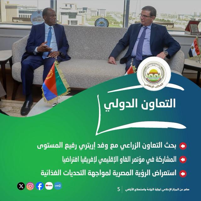 كما كثفت الوزارة جهودها في متابعة مشروعات التنمية الزراعية حيث تم تفقد مشروعات في وادي الصعايدة ووادي النقرة شملت استصلاح 5000 فدان وتطوير نظم الري والطاقة الشمسية ودعم صغار المزارعين