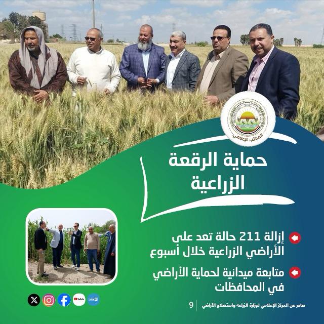 ميدانيا كثفت الوزارة جهودها الرقابية حيث نجحت في ضبط محل بالقليوبية ينتحل صفة الوزارة ويبيع لحوما غير صالحة كما واصلت حملات إزالة التعديات على الأراضي الزراعية والتي أسفرت عن إزالة 211 حالة خلال أسبوع منها 207 حالات في المهد، وفي إطار دعم الصادرات ورفع كفاءة منظومة سلامة الغذاء أعلنت الوزارة رفع القدرة الاستيعابية للمعمل المركزي لمتبقيات المبيدات إلى 400 ألف عينة سنويا بعد التعاقد على أجهزة حديثة كما استقبل المعمل وفدا من شركات الصناعات الغذائية لتعزيز التعاون.
