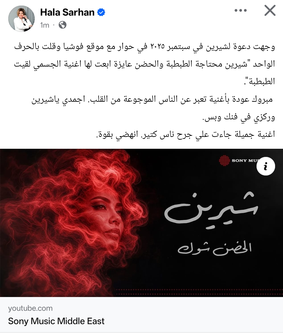 وكتبت هالة سرحان من خلال حسابها الرسمي عبر موقع التواصل الاجتماعي فيسبوك، قالت: وجهت دعوة لشيرين في سبتمبر ٢٠٢٥ في حوار مع موقع فوشيا وقلت بالحرف الواحد "شيرين محتاجة الطبطبة والحضن عايزة ابعت لها اغنية الجسمي لقيت الطبطبة".