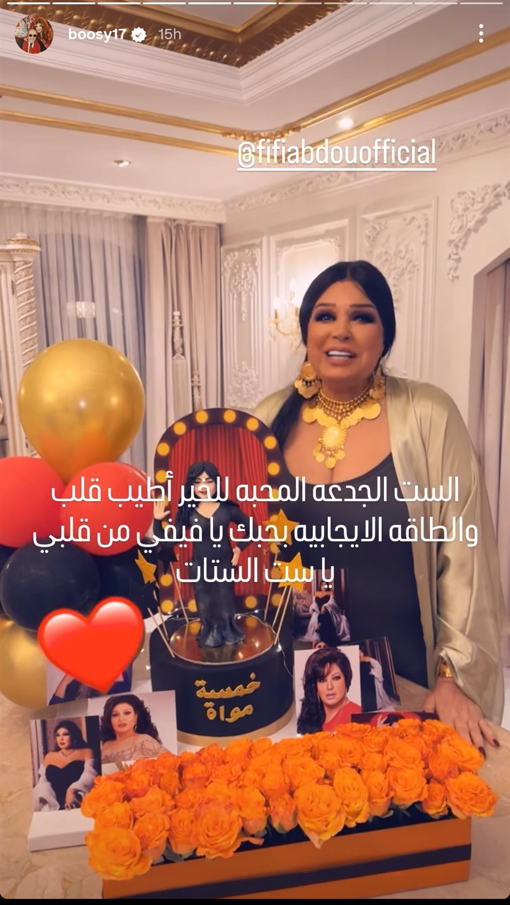 وشاركت بوسي شلبي جمهورها صورا تجمعها بفيفي عبده من خلال حسابها الرسمي عبر موقع تبادل الصور والفيديوهات القصيرة إنستجرام، عبر خاصية ستوري، وكتبت: الست الجدعة المحبة للخير أطيب قلب والطاقة الإيجابية.. بحبك يا فيفي من قلبي يا ست الستات.
