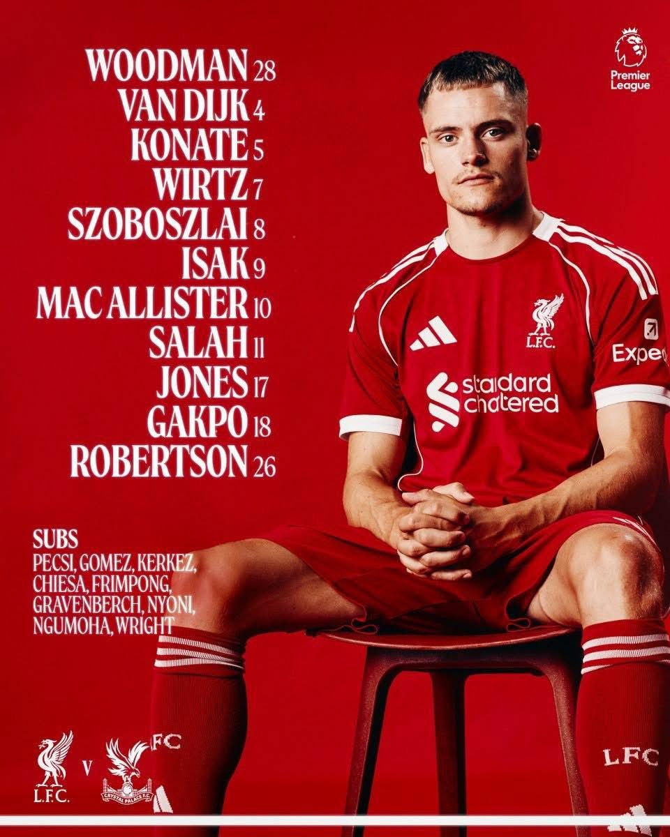 كشف أرني سلوت المدير الفني لفريق ليفربول عن تشكيل فريقه الذي سيلعب بعد قليل ضد كريستال بالاس بالدوري الإنجليزي.