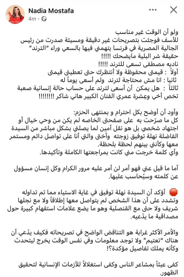 وكتبت نادية مصطفى في منشور مطوّل: «ولو أن الوقت غير مناسب.. للأسف فوجئت بتصريحات غير دقيقة ومسيئة صدرت من رئيس الجالية المصرية في فرنسا يتهمني فيها بالسعي وراء الترند.. حقيقة شر البلية ما يضحك»، معبرة عن استيائها من تلك الاتهامات.