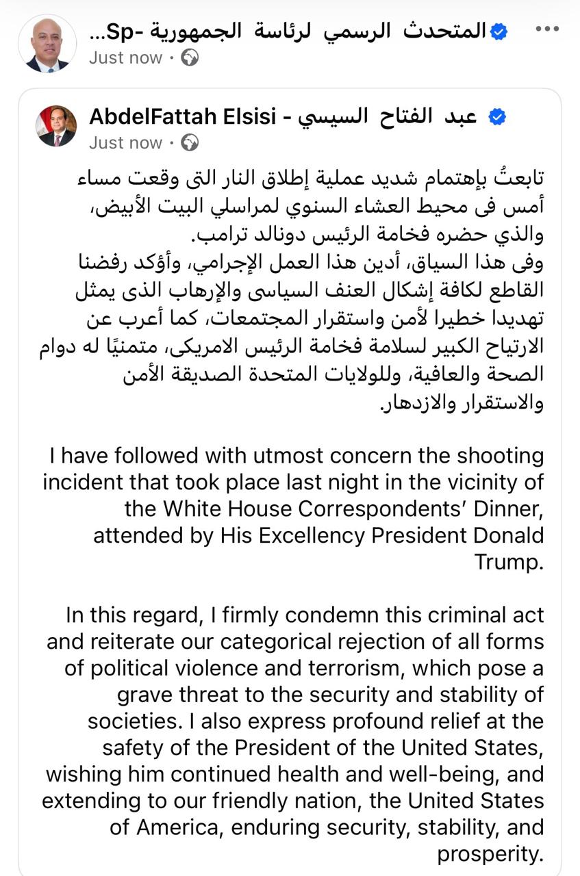 وقال السيد الرئيس عبر صفحته الرسمية على مواقع التواصل الاجتماعي: "تابعتُ باهتمام شديد عملية إطلاق النار التي وقعت مساء أمس فى محيط العشاء السنوي لمراسلي البيت الأبيض، والذي حضره فخامة الرئيس دونالد ترامب."