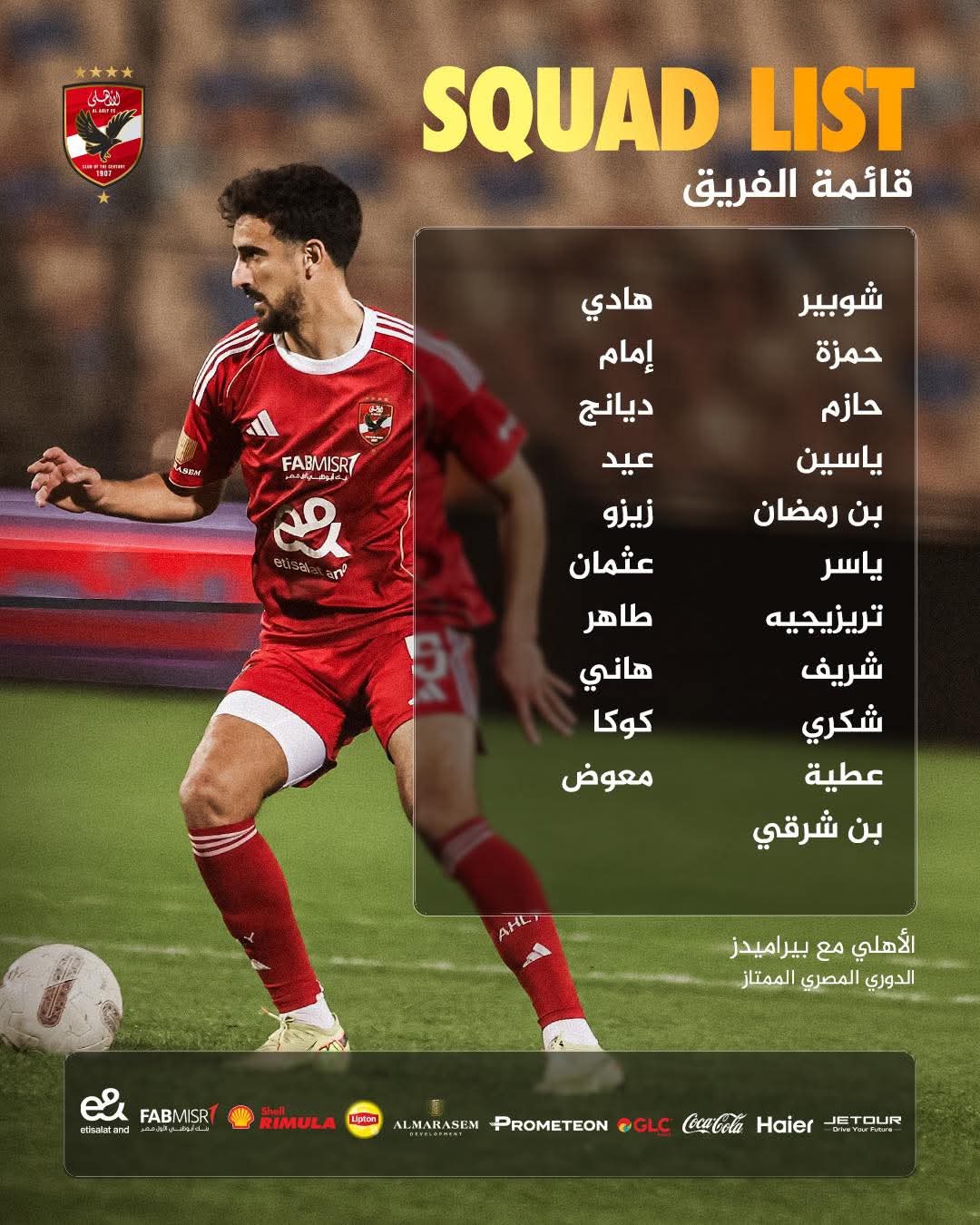 وشهدت القائمة تواجد عمر سيد معوض، بينما غاب الحارس محمد الشناوي بسبب الإيقاف، إلى جانب غياب يوسف بلعمري للإصابة، ويليسن كامويش لأسباب فنية.