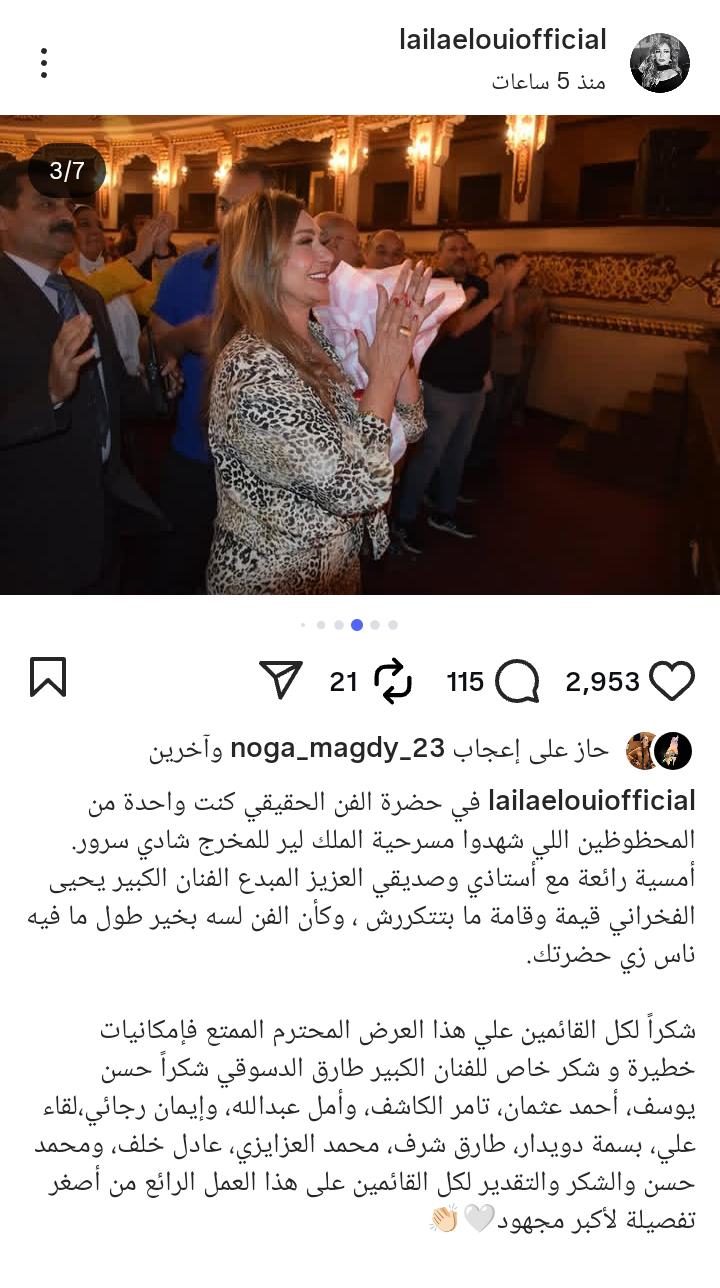 وعبرت ليلى علوي عن مشاعرها تجاه العرض من خلال منشور عبر حسابها على “إنستجرام”، حيث كتبت: «في حضرة الفن الحقيقي كنت واحدة من المحظوظين اللي حضروا مسرحية الملك لير»، مضيفة: «أمسية مميزة مع أستاذي وصديقي العزيز المبدع يحيى الفخراني.. قيمة وقامة فنية لا تتكرر، وكأن الفن ما زال بخير بوجودك»، وهو ما عكس تقديرها الكبير لمسيرته الفنية الطويلة وقدرته على التألق المسرحي.