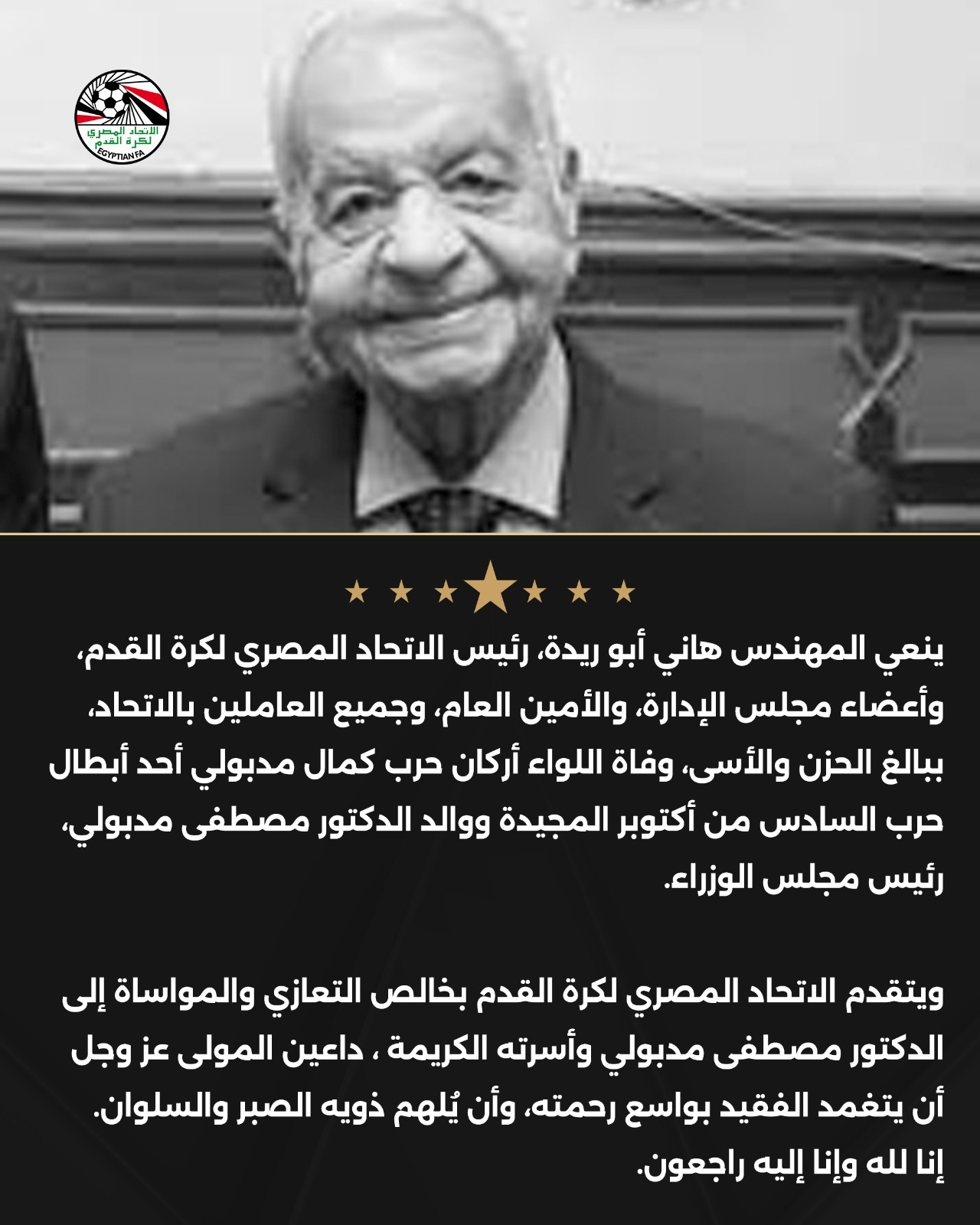 ينعي المهندس هاني أبو ريدة، رئيس الاتحاد المصري لكرة القدم، وأعضاء مجلس الإدارة، والأمين العام، وجميع العاملين بالاتحاد، ببالغ الحزن والأسى، وفاة اللواء أركان حرب كمال مدبولي أحد أبطال حرب السادس من أكتوبر المجيدة ووالد الدكتور مصطفى مدبولي، رئيس مجلس الوزراء.