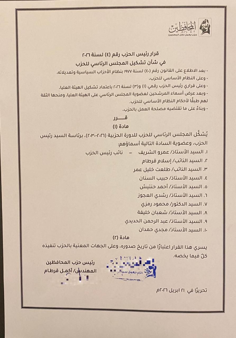 أعلن الحزب اختيار المهندس أكمل قرطام رئيسا للمجلس الرئاسي الجديد بصفته رئيسا للتنظيم، ليتولى المهام القيادية رفقة نخبة من الكوادر السياسية، وتضمنت قائمة العضوية عمرو الشريف في منصب نائب رئيس حزب المحافظين، إضافة إلى عضوية النائب إسلام قرطام والنائب طلعت خليل عمر، وتأتي هذه الخطوة استكمالا للقرارات التنظيمية السابقة رقمي 1 و3 لسنة 2026، والتي أرست القواعد الأساسية لتشكيل الهياكل القيادية العليا.