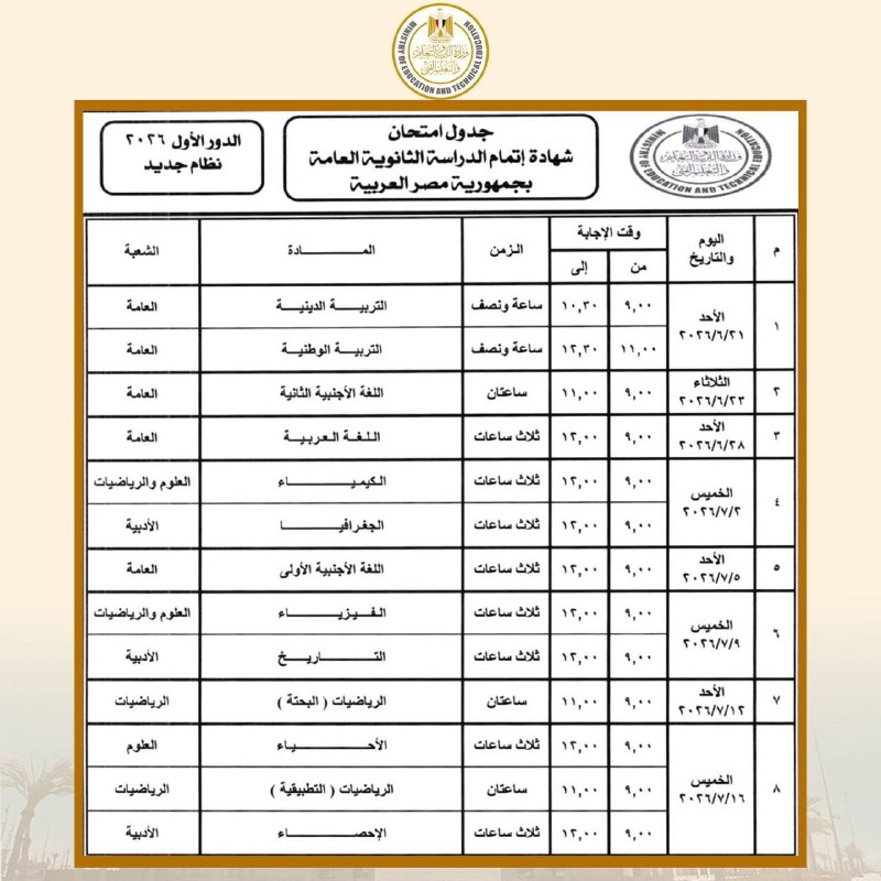 أعلنت وزارة التربية والتعليم جدول امتحانات الثانوية العامة 2026 للنظام الجديد، والذي جاء كالتالي: