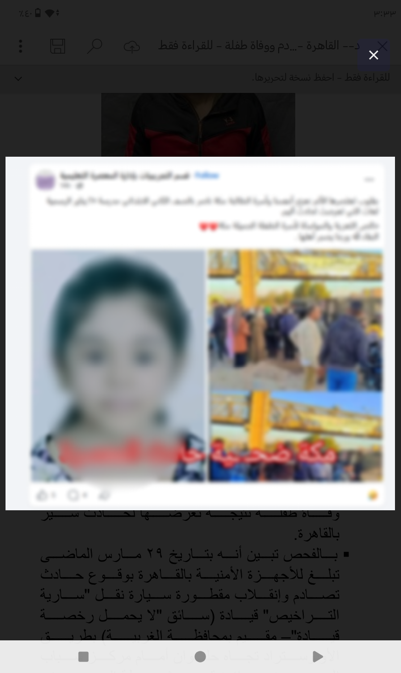 في إطار جهود الأجهزة الأمنية لكشف ملابسات ما تم تداوله عبر مواقع التواصل الاجتماعي بشأن وفاة طفلة إثر حادث سير، أوضحت الجهات المختصة تفاصيل الواقعة التي شهدتها محافظة القاهرة.