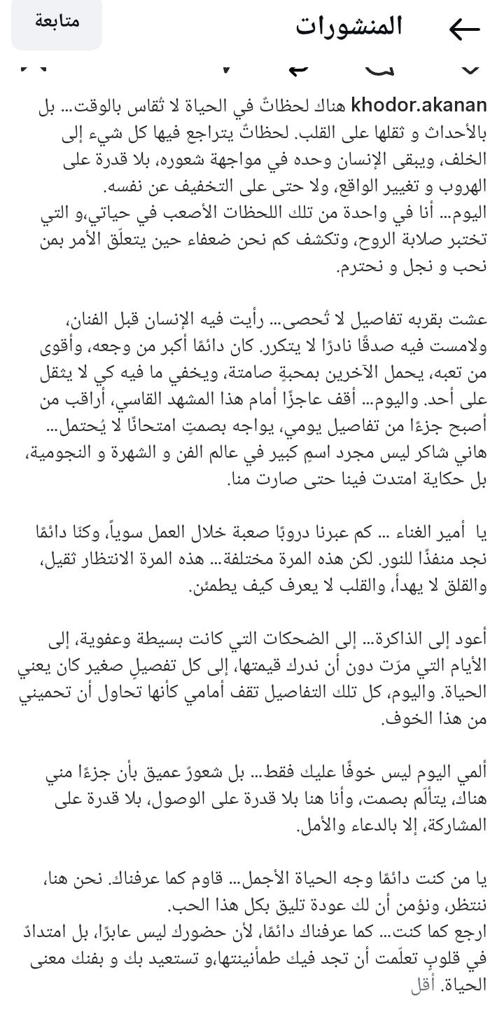 علق وكيل أعمال الفنان هاني شاكر على حالته الصحية برسالة مؤثرة عبر صفحته الرسمية على موقع التواصل الاجتماعي “إنستجرام”، عبّر خلالها عن حزنه الشديد وقلقه الكبير، في كلمات لاقت تعاطفًا واسعًا من المتابعين.