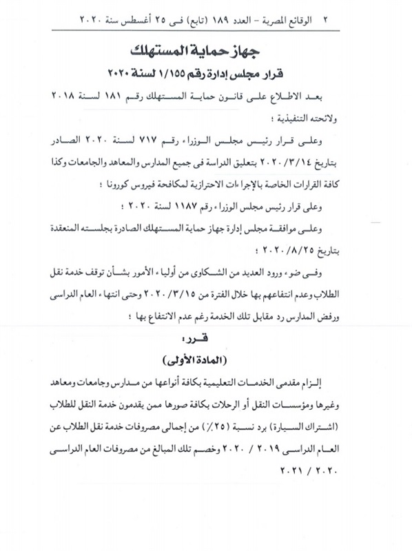 وأشار رئيس الجهاز الى ان مجلس الادارة قد اصدر قراره رقم 155 /1 بتاريخ اليوم الثلاثاء 25/8/2020 بالزام كافة مقدمى الخدمات التعليمية ( مدارس، جامعات، معاهد )ومؤسسات النقل أو الرحلات بكافة صورها ممن يقدمون خدمات نقل الطلاب من خلال تحصيل اشتراكات ، برد نسبة 25% من اجمالى مصروفات خدمة النقل المتعاقد عليها خلال العام الدراسى الماضى 2019/2020 وذلك عن طريق خصم تلك القيمة من مصروفات العام الدراسى الجديد 2020/2021.