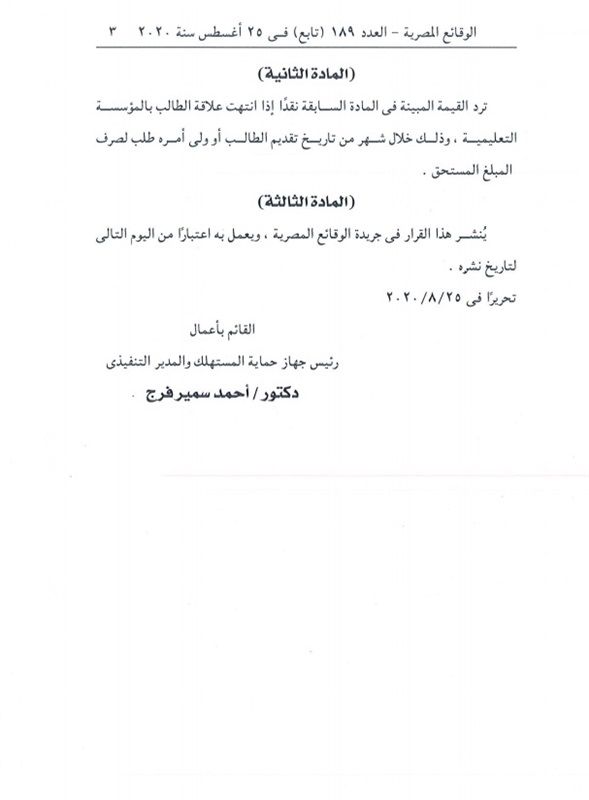 حماية المستهلك تلزم المدارس والمعاهد والجامعات برد 25% من اجمالى المصروفات للطلاب