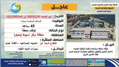 تعلن شركة مياه الشرب والصرف الصحي بأسيوط والوادى الجديد عن بدء أعمال صيانة دورية تشمل تطهير وتعقيم الخزانات الأرضية بمحطة مرشحات
