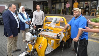 سلم اللواء دكتور هشام أبو النصر محافظ أسيوط؛ مركبة تروسيكل لأحد الأشخاص من ذوي الإعاقة تلبية لطلبه ومساعدته على أعباء المعيشة بالمشاركة المجتمعية .