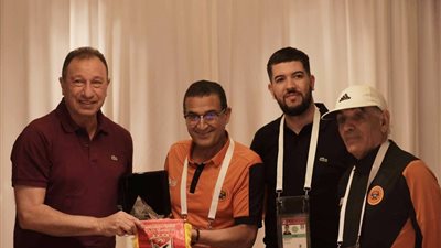 حرص محمود الخطيب، رئيس النادي، رئيس بعثة فريق الكرة المتواجدة في قطر، على إهداء عبد المجيد مضران، نائب رئيس.