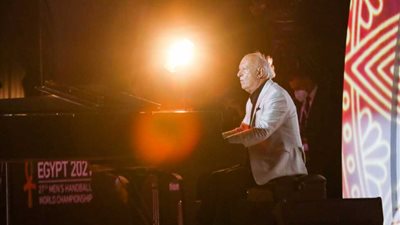اشعل الفنان الكبير عمر خيرت حفل قرعة كأس العالم لكرة اليد، تحت سفح الأهرامات بسيمفونية موسيقية، أطربت الحضور