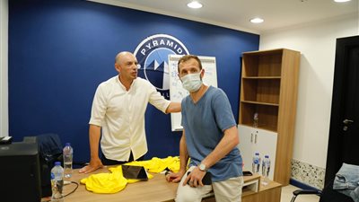 عقد الأرجنتيني رودلفو أروابارينا المدير الفني السابق لفريق نادي بيراميدز جلسة ودية مع المدير الفني الجديد اليوناني تاكيس