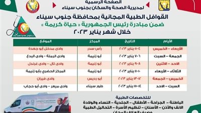أعلنت مديرية الصحة بجنوب سيناء فى بيان رسمى لها اليوم عن القوافل الطبية وأماكن تواجدها فى مدن جنوب سيناء خلال شهر يناير الحالى .