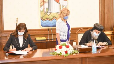 وقع قداسة البابا تواضروس الثاني، بابا الإسكندرية وبطريرك الكرازة المرقسية، والسفيرة نبيلة مكرم عبدالشهيد وزيرة