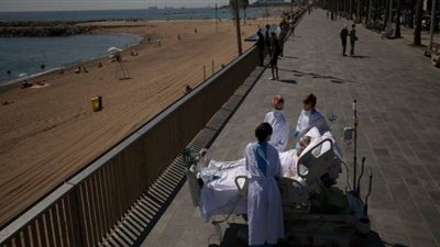 قام فريق ممرضين بمستشفى يقع على شاطئ البحر بمدينة برشلونة، بنقل مريض بـ فيروس كورونا إلى الشاطئ للاستمتاع بهواء البحر النقي، بعد بقائه لمدة شهرين للعلاج في المستشفى.