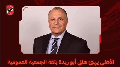 تقدم مجلس إدارة النادي الأهلي برئاسة محمود الخطيب والإدارة التنفيذية والقطاعات الرياضية، بالتهنئة لـ هانى أبو ريدة بعد فوز قائمته فى انتخابات، التي أقيمت بمقر مركز المنتخبات الوطنية مشروع الهدف