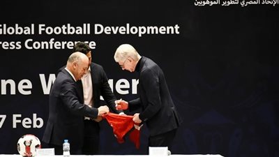 اهدى هاني أبوريدة رئيس اتحاد الكرة قميص منتخب مصر إلى الفرنسي ارسين فينجر مدير التطوير بالاتحاد الدولي