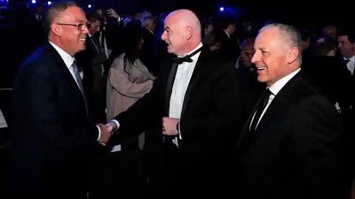 تقدم السويسري جياني إنفانتينو رئيس الاتحاد الدولي لكرة القدم، فيفا، والجنوب أفريقي باتريس موتسيبي رئيس الاتحاد الأفريقي لكرة القدم، بالتهنئة للمهندس هاني أبوريدة، عضو مجلس الفيفا والمكتب التنفيذي