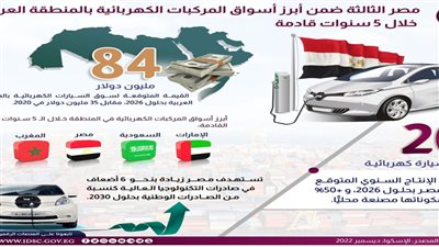 نشر مركز معلومات مجلس الوزراء إنفوجرافيك جديدا بعنوان: مصر الثالثة ضمن أبرز أسواق المركبات الكهربائية بالمنطقة العربية خلال 5 سنوات قادمة . الإسكوا: مصر ضمن أبرز 3 أسواق للمركبات الكهربائية بالمنطقة خلال 5 سنوات تناول الإنفوجرافيك توقعات سوق السيارات الكهربائية بالمنطقة العربية خلال الخمس سنوات