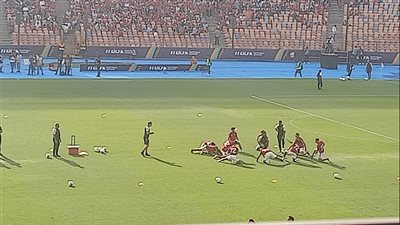 نزل لاعبي الفريق الأول لكرة القدم بالنادي الأهلي لاجراء عمليات الاحماء على ستاد القاهرة استعداداً لمواجهة سيمبا