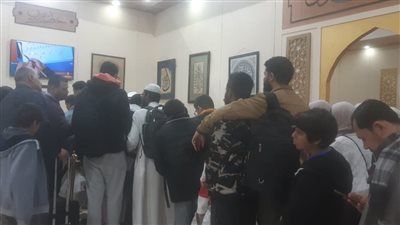 احتشد عدد كبير من الشباب والأطفال أمام ركن الخط العربى بجناح الأزهر الشريف بقاعة ٤ بمعرض القاهرة الدو