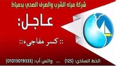 أعلنت شركة مياه الشرب والصرف الصحى بدمياط أنه نظرا لظروف خارجة عن إرادتها بحدوث كسر مفاجىء بخط 12