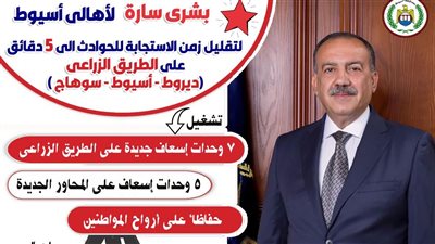 أعلن اللواء هشام أبو النصر محافظ أسيوط، عن استلام وتشغيل عدد 7 وحدات إسعاف جديدة على الطريق الزراعى أسيو