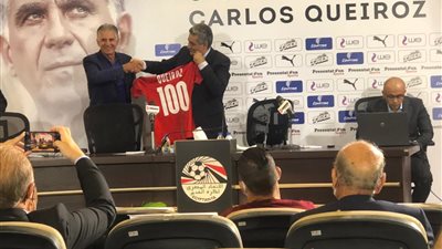 أهدى أحمد مجاهد، رئيس اتحاد الكرة المصرى، البرتغالى كارلوس كيروش المدير الفنى الجديد لمنتخب مصر قميص الـ100 احتفالا بمرور