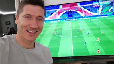 يتابع روبيرت ليفاندوفسكى، مهاجم فريق بايرن ميونخ الألمانى، مباراة فريقه أمام باريس سان جيرمان الفرنسى والتى