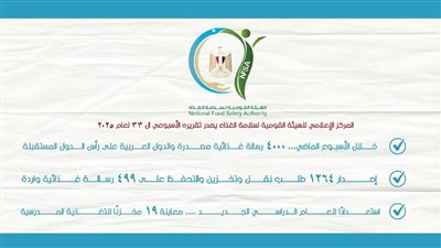 اصدر المركز الإعلامي للهيئة القومية لسلامة الغذاء تقريره الأسبوعي الـ 42 لعام 2025، وذلك عن الفترة من 8 - 14 نوفمبر، والذي تضمن العديد من الأنشطة المختلفة على النحو التالي: