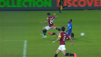 تدخل حمدي فتحي لاعب المنتخب المصري ومنع فرصة هدف محققة لمنتخب الكونغو في الدقيقة 28 من الشوط الأول في